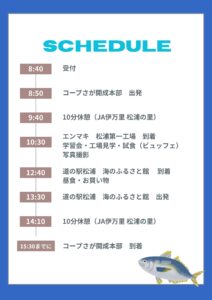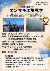 内容:産直さばフィーレやプレミアムあじフライで有名な日本遠洋旋網漁業協同組合(エンマキ)と産直交流を行います!!