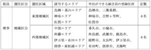 推薦に先立ち、地域区分理事候補者として区域別役員推薦委員会の推薦を受けたい組合員は、その旨を申出ることができます。各推薦委員会は申し出のあった組合員及び理事会推薦候補者の中から、各選任定数において、推薦すべき候補者を決定します。 ついては、定款第19条及び役員選任規約第7条に基づき、下記の事項を公告します。